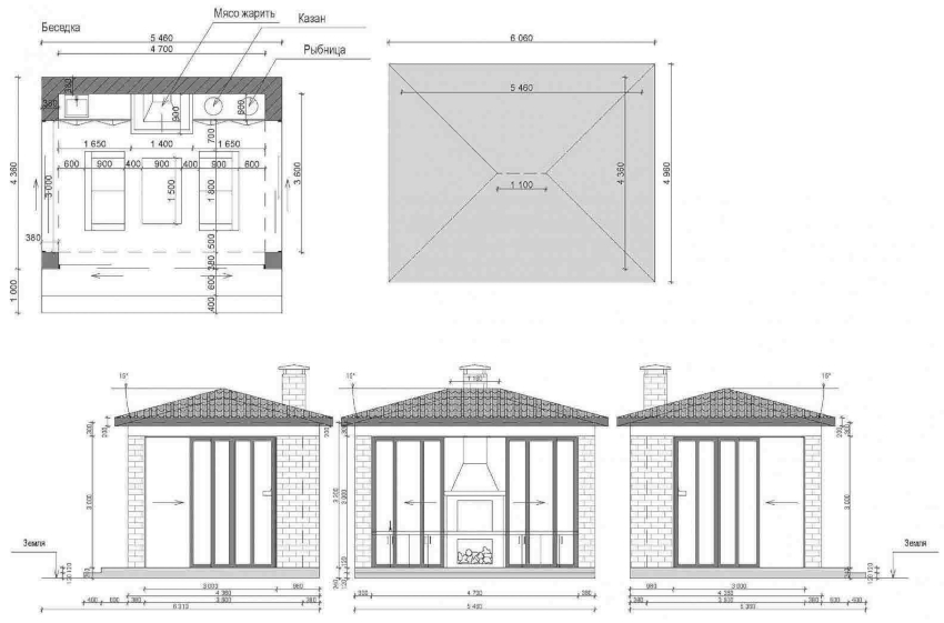 Si planea instalar un horno de ladrillos o una barbacoa en la glorieta con sus propias manos, la construcción debe pensarse incluso en la etapa de elaboración del dibujo, porque su presencia afecta las características de la estructura del techo. Por lo tanto, debe organizar los orificios para la chimenea, el embrague contra incendios y también para el aislamiento.