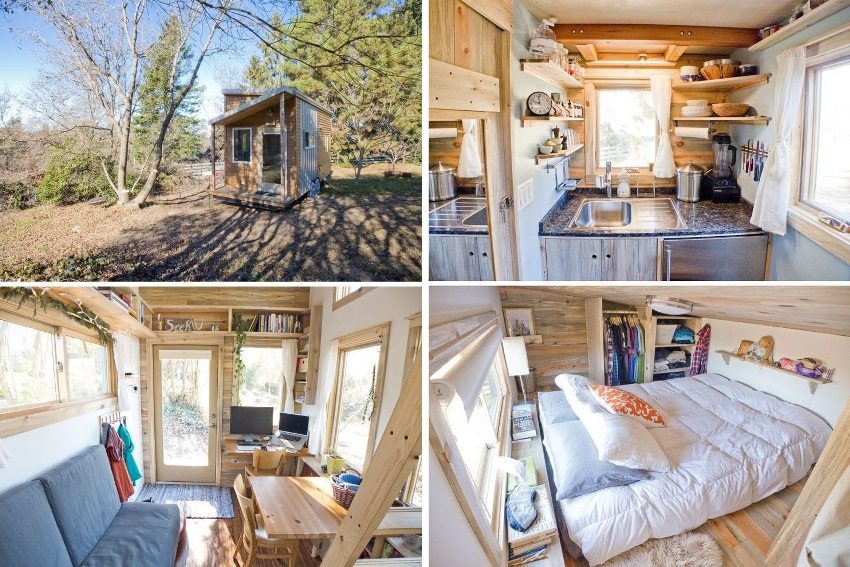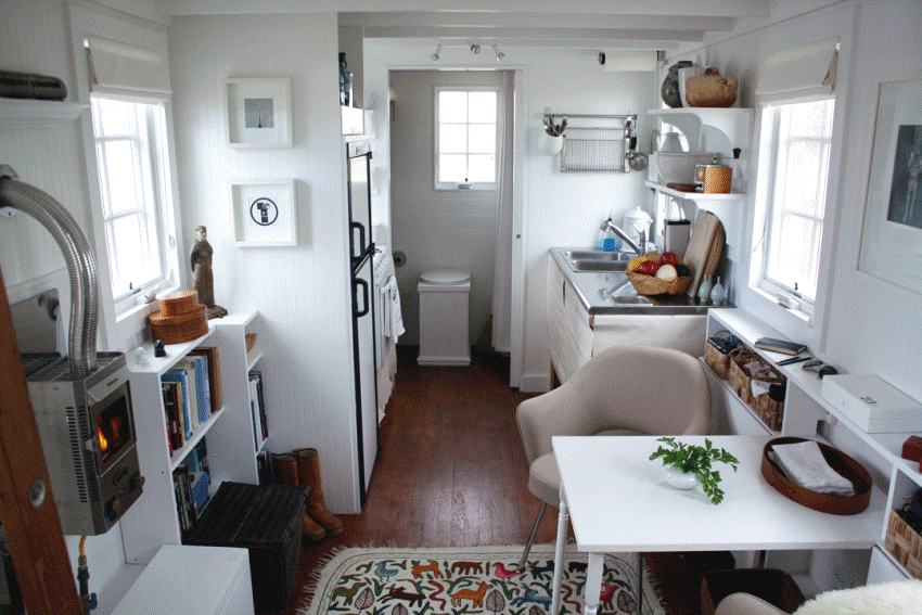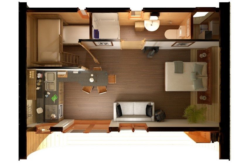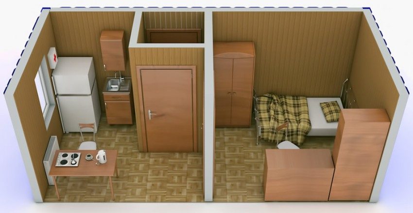El debate más acalorado gira en torno a la mejor distribución del espacio en las cabañas. El diseño de un bloque residencial está limitado por el área total, por lo que para las cajas minimalistas (3x2,3 metros) la única opción de diseño posible es un espacio sin tabiques. Los locales más amplios se subdividen en remolques con una habitación y secciones de servicio (vestíbulo, baño, bloque de servicios) y las mismas cabañas, pero con veranda o porche.