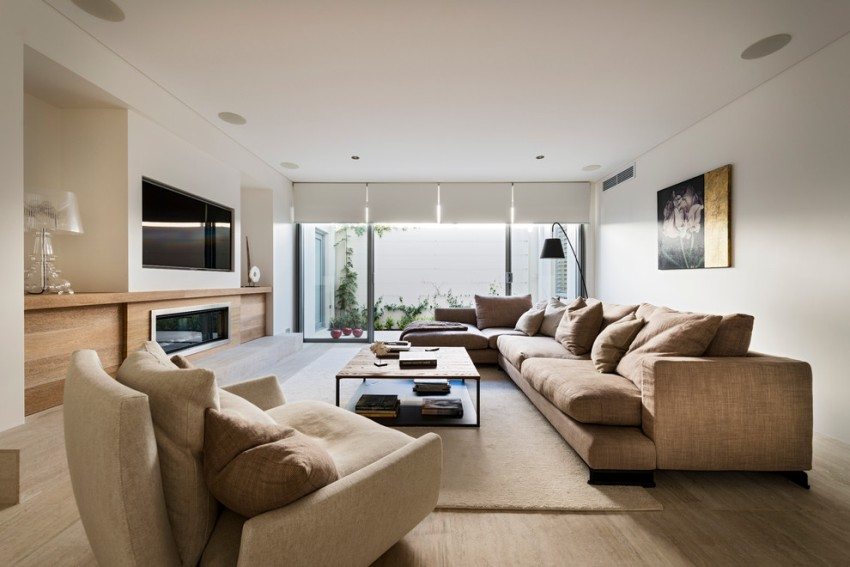 División racional del espacio en zonas funcionales: entrada, sala de estar, comedor y grupo de chimenea
