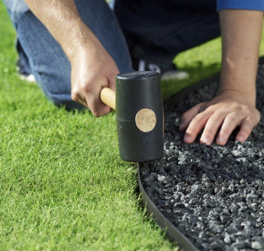 Primero debe delinear el contorno del camino y la altura del bordillo. La mayoría de los fabricantes producen productos que tienen orificios en el exterior para colocar anclajes o marcar clavijas. Gracias a esta sujeción, la fijación del bordillo al suelo es fuerte y fiable. Para el trabajo, solo necesitará un martillo para clavar las clavijas de metal.