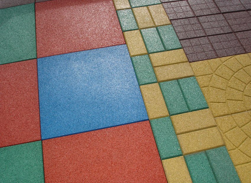 Dado que el caucho es un material que se puede pintar, los diferentes tipos de losas de pavimento de caucho granulado pueden tener una amplia gama de colores. El producto se fabrica a partir de miga, por lo que la superficie de trabajo tiene un aspecto granulado mate. Colores populares: terracota, verde, azul, amarillo, marrón, naranja, negro.