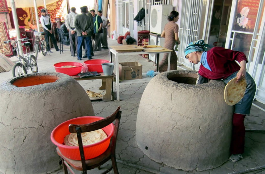 Antes de hornear en el tandoor, los panes planos deben humedecerse para una mejor adherencia de la masa a la superficie. Para recolectar la grasa que fluye de los platos de carne, se usa un recipiente especial, que se encuentra debajo de la carne.
