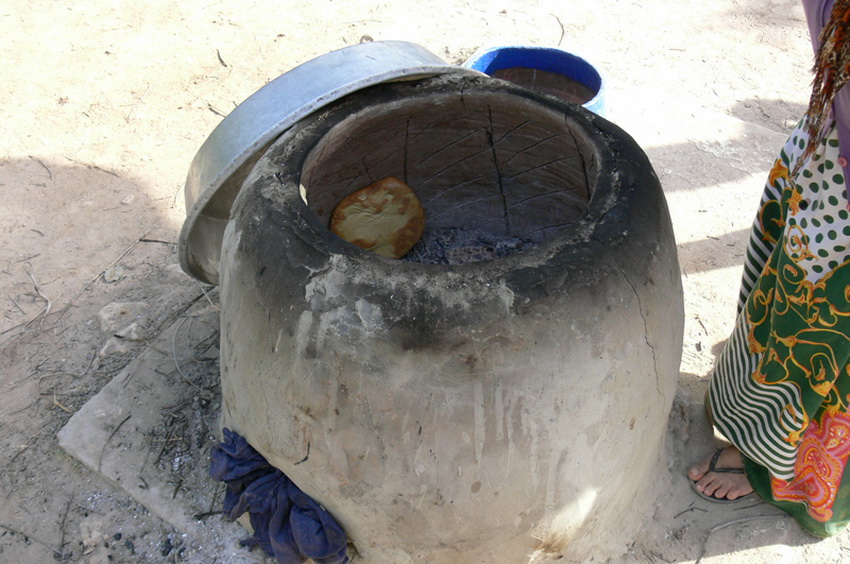 La leña o el carbón se apilan a través del orificio superior. Una vez que el combustible se ha quemado por completo, el hollín que cubre la superficie interior se cae, dejando el recubrimiento limpio. Esto significa que se pueden cargar alimentos en el horno. Antes de hornear, se elimina la ceniza resultante. En el caso de la carne, esto no es necesario. Las tortas de masa se pegan al interior del horno.