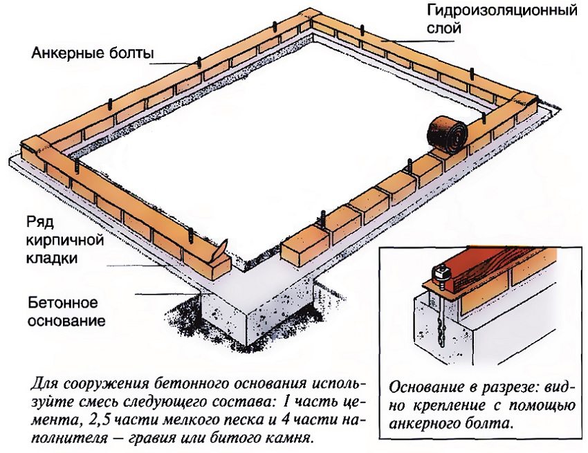 La base de ladrillo durará lo suficiente, pero los costos de construcción serán significativos. Para la construcción de dicha base, se hace una almohadilla impermeabilizante para evitar el efecto negativo de la suciedad. Para la mampostería, se usa una solución de cemento con arena.