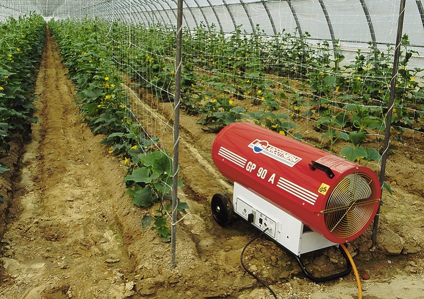 - Calefacción de gas: para calentar de esta manera, se utiliza un complejo de quemadores de gas, que se instalan en todo el invernadero. El funcionamiento de dicho sistema de calefacción proporciona ventilación y flujo de aire de alta calidad.