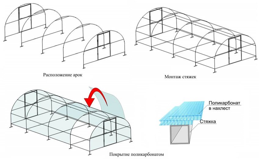 Instalación de láminas de policarbonato en el marco del invernadero de una estructura arqueada de un perfil de aluminio