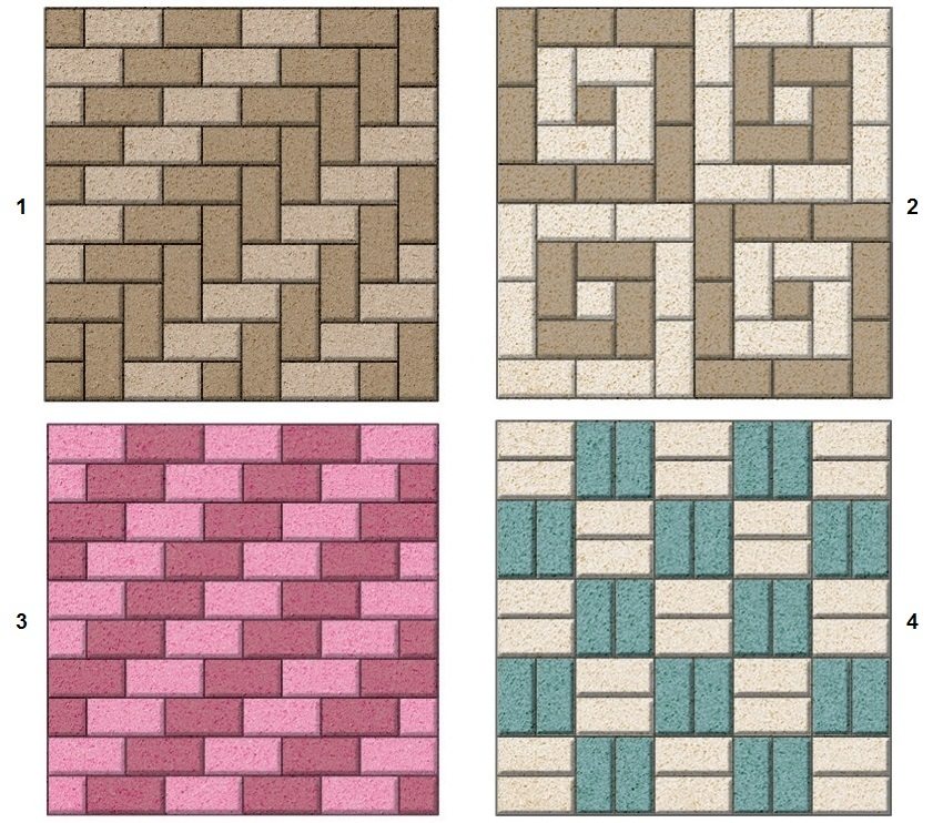 Ejemplos de esquemas simples para colocar losas de pavimento: 1 - espiga, 2 - espiral, 3 - escalera, 4 - tablero de ajedrez