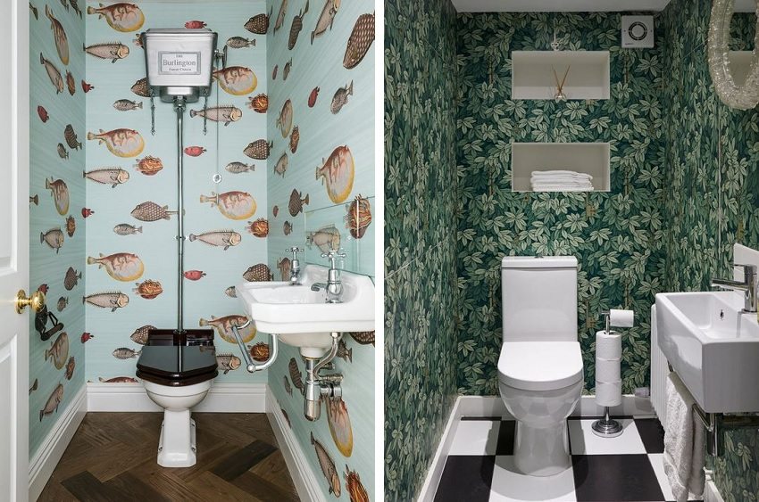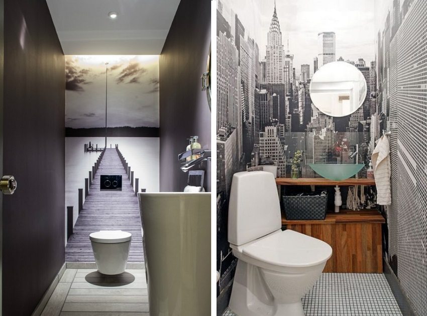 Las fotos de papel tapiz para un inodoro en un apartamento muestran que incluso la habitación más pequeña, en la que apenas cabe la plomería, puede agrandarse visualmente debido a la elección correcta del patrón y el color. La mejor opción es un punto brillante (adorno, dibujo, etc.) sobre un fondo de colores pastel.