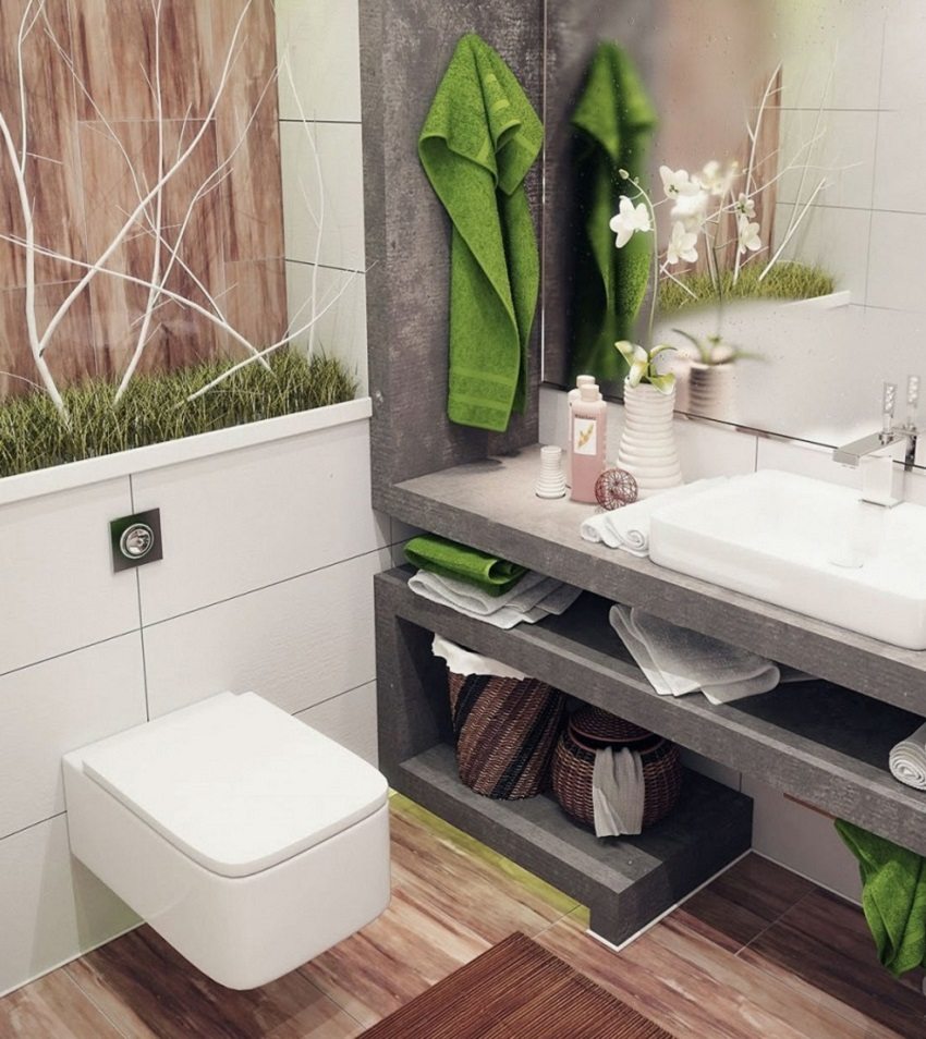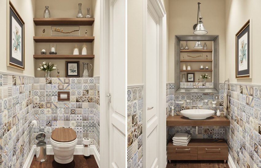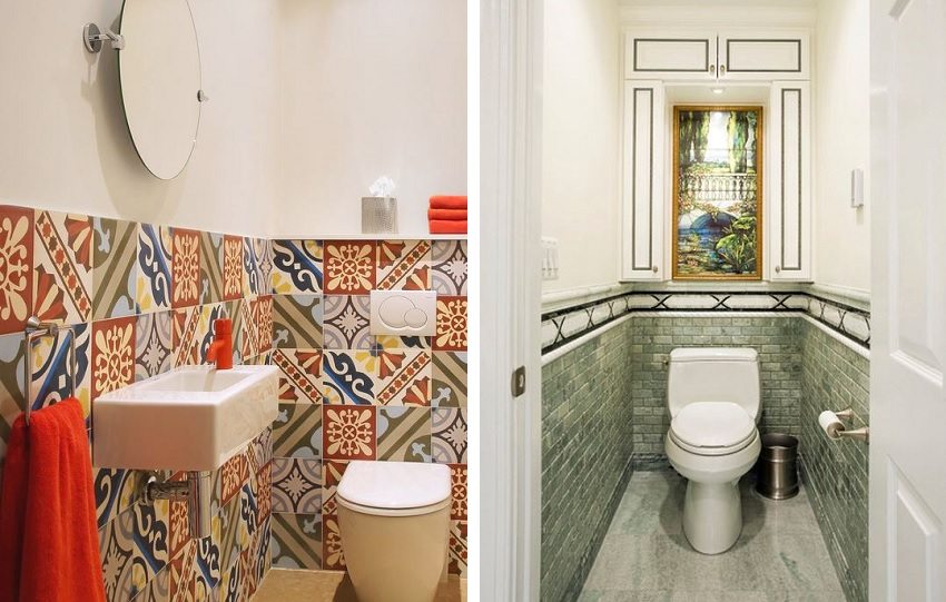 - las fotos de terminar el diseño del inodoro con azulejos se ven bien y con estilo, pero esta no es la única solución. No tenga miedo de usar diferentes materiales, experimente con sus combinaciones;