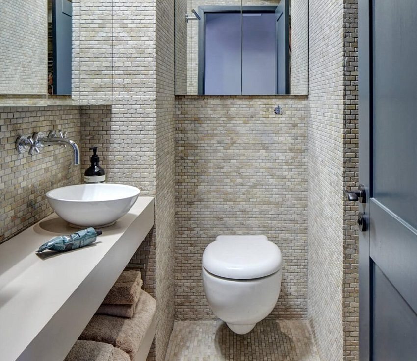 ¡Consejo útil! Al renovar un inodoro con azulejos, lo mejor es utilizar una instalación de junta a junta. Esto ayudará a ahorrar no solo espacio sino también materiales de construcción.