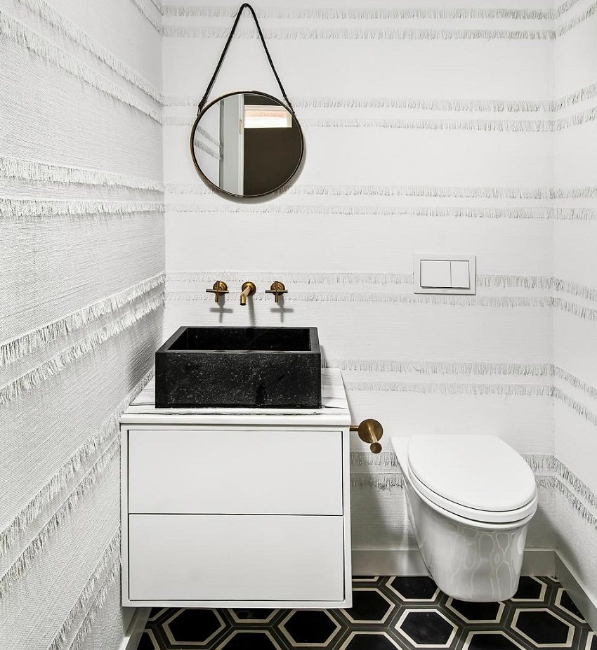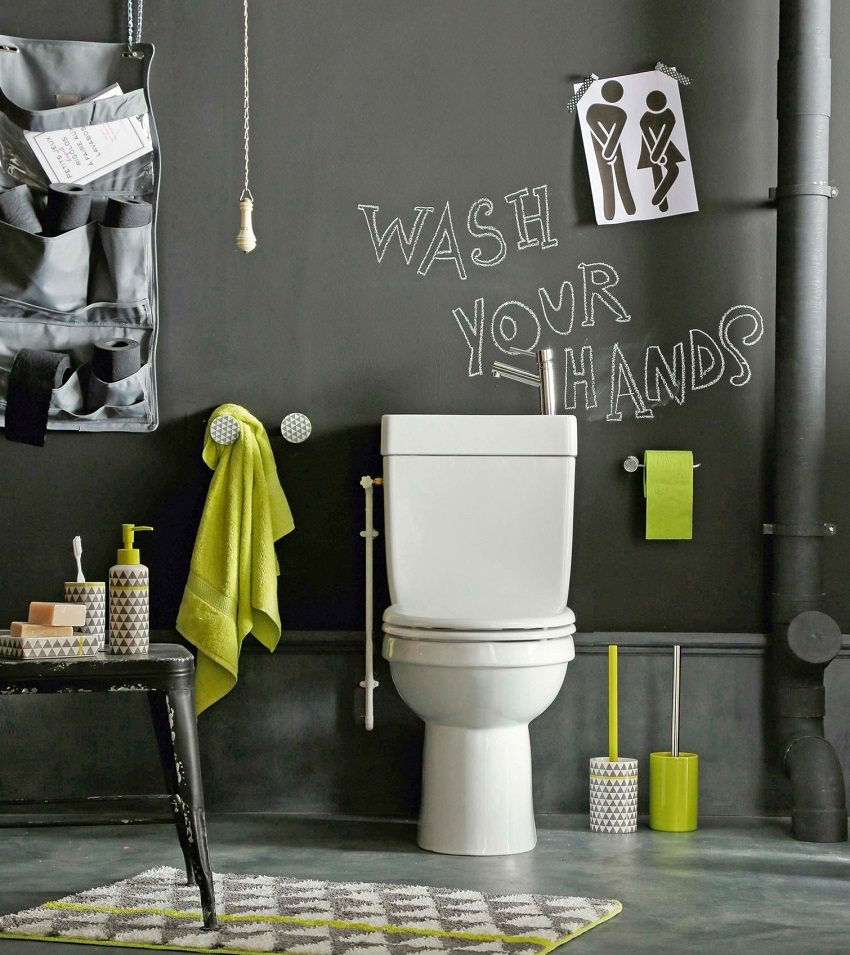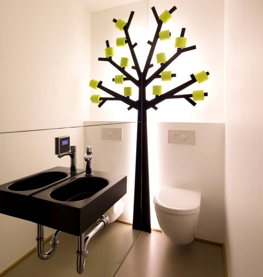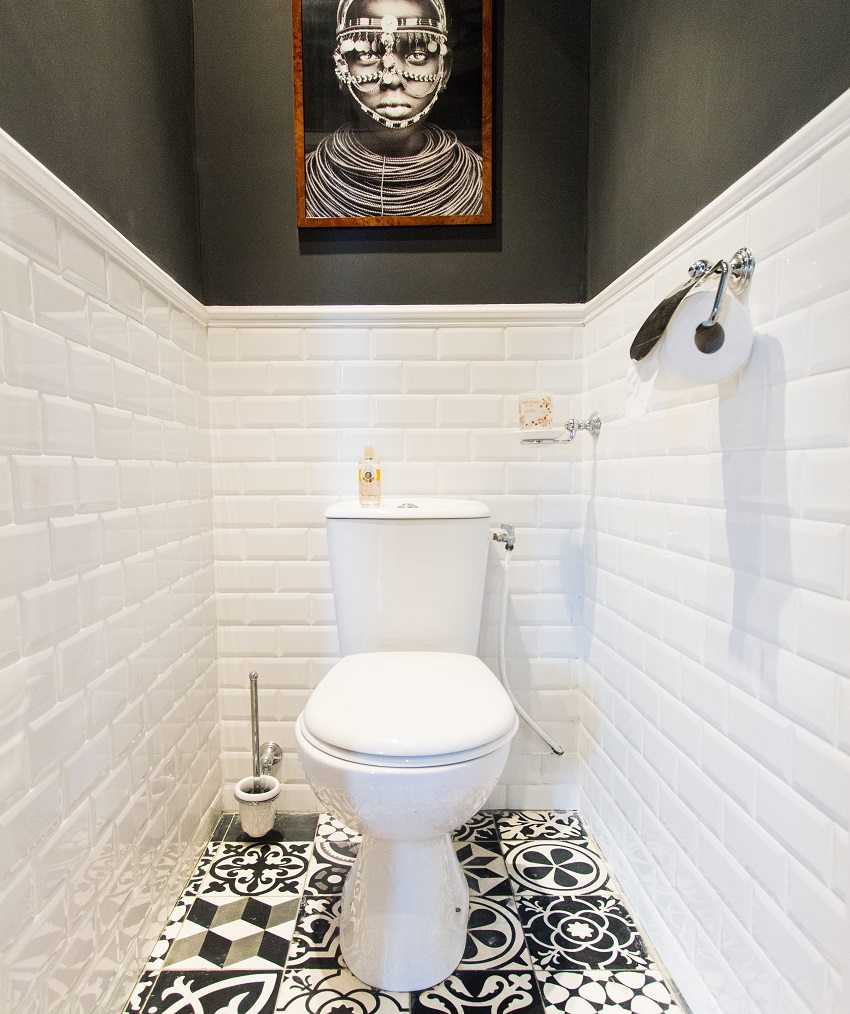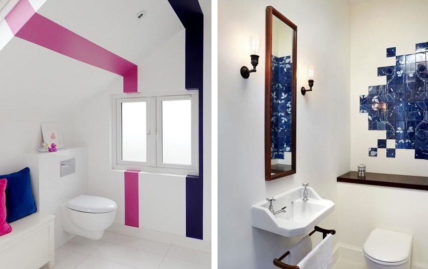 - no utilice materiales del mismo color. Un inodoro es una habitación puramente utilitaria, pero tampoco vale la pena convertirlo en una habitación estéril sin características sobresalientes. Si el color predominante de las paredes y el piso del inodoro es el blanco, entonces vale la pena refrescarlo con un patrón original de azulejos o elementos decorativos. De lo contrario, se creará la sensación de una sala médica estéril, y esto no es lo que se necesita para un inodoro;