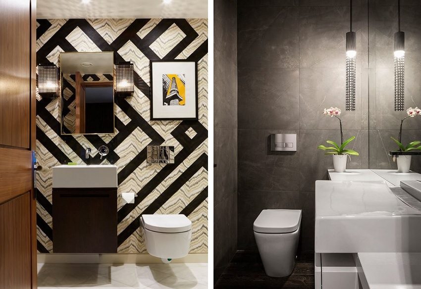 Pero no creas que el espacio interior del inodoro debe hacerse en blanco o en colores claros. Las paredes negras o simplemente oscuras en el inodoro también son una buena opción de diseño. Con la ayuda de tonos oscuros, se crea un contraste que se ve muy atractivo y elegante. Y la plomería blanca contra el fondo de paredes y pisos oscuros parecerá más limpia. Lo principal aquí es la iluminación adecuada, para no crear una sensación de tristeza. Una buena opción de diseño son los suelos claros y las paredes oscuras.