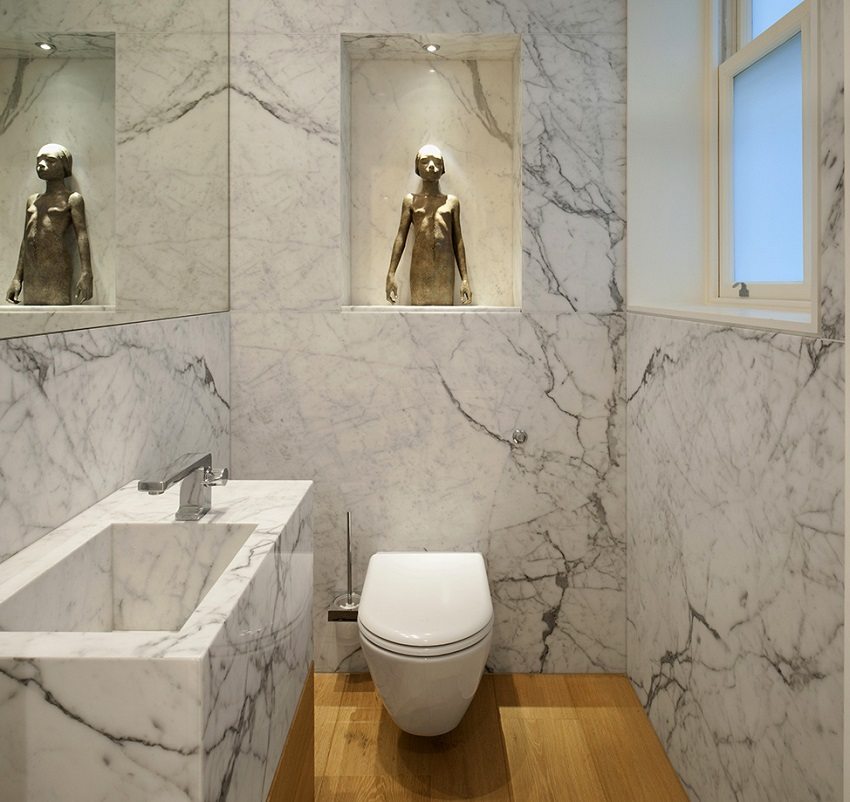 Decorar las paredes y pisos del baño con mármol artificial o natural también es una opción muy práctica, que será bastante cara, pero demostrará tu buen gusto y situación financiera a todos los invitados. El mármol es uno de los materiales más duraderos para la decoración, no le teme a la corrosión, la humedad, no se borra con el tiempo, se ve lujoso. Su único inconveniente es el alto precio, pero merece la pena.
