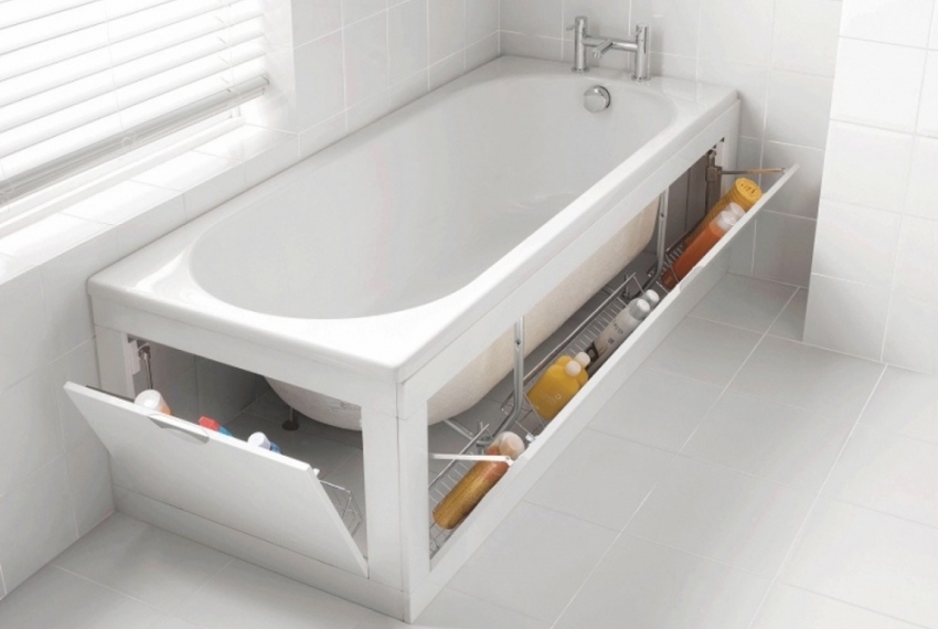 - un modelo con puertas permite no solo proteger las comunicaciones, sino también organizar un pequeño almacén debajo del baño para productos químicos domésticos y otros artículos;