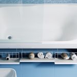 En algunos casos, el baño se diferencia en que tiene comunicaciones que sobresalen o un zócalo, cuya presencia evita que el espacio libre debajo del baño bloquee completamente el escudo. ¿Cómo instalar una mampara debajo del baño en tal situación? Lo mejor es medir los parámetros de los elementos que sobresalen y hacer un agujero correspondiente en la pantalla. Entonces, la pantalla no chocará contra el elemento que sobresale de la unidad de plomería. Por supuesto, puede remodelar el baño, pero este evento más costoso y que requiere más tiempo no es adecuado para todos.