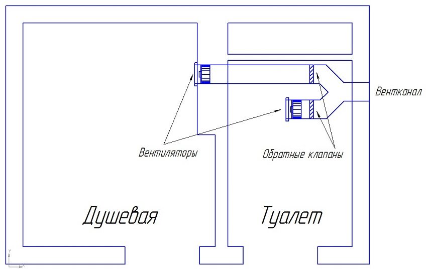 El principio de cableado de ventilación en un baño con un conducto de ventilación común y válvulas de retención.