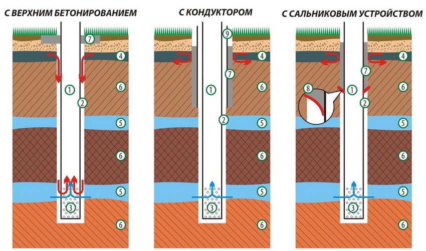 Bien opciones de ejecución. 1-revestimiento de producción, 2- espacio anular, 3 - parte filtrante del revestimiento, 4 - "agua superior", 5 - acuíferos, 6 - capas impermeables (arcillas densas), 7 - relleno de cemento, 8 - prensaestopas, 9 - acero ciego columna (conductor)