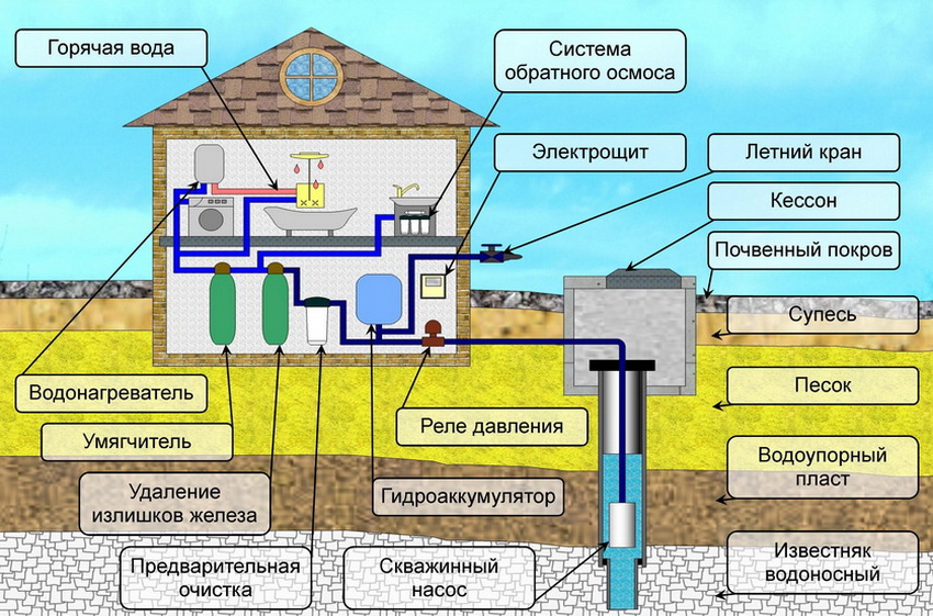Suministro de agua de una casa privada de un pozo: esquema de comunicación.