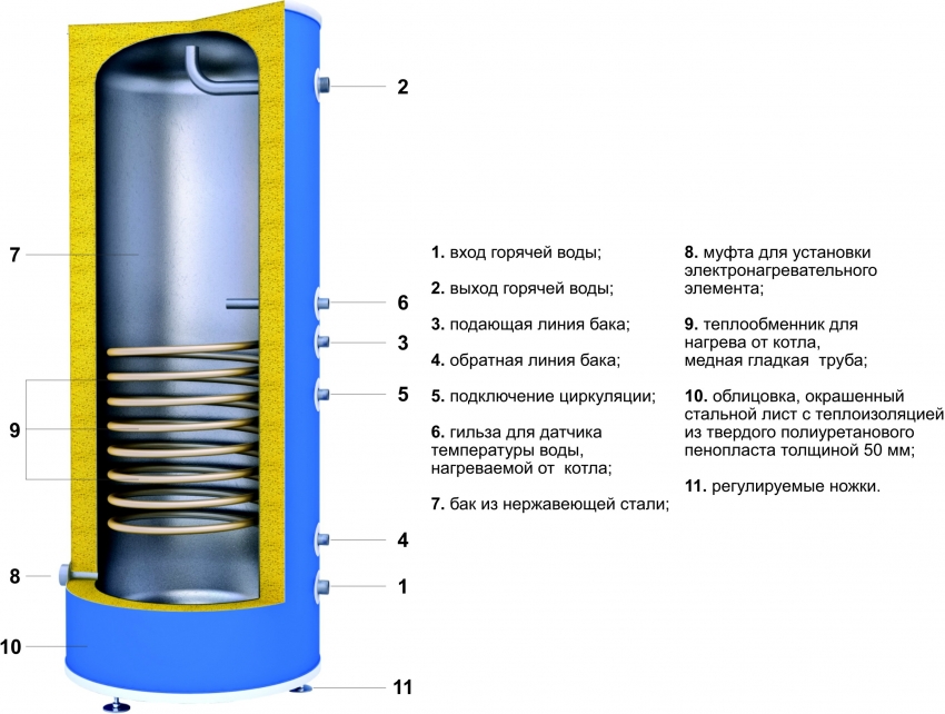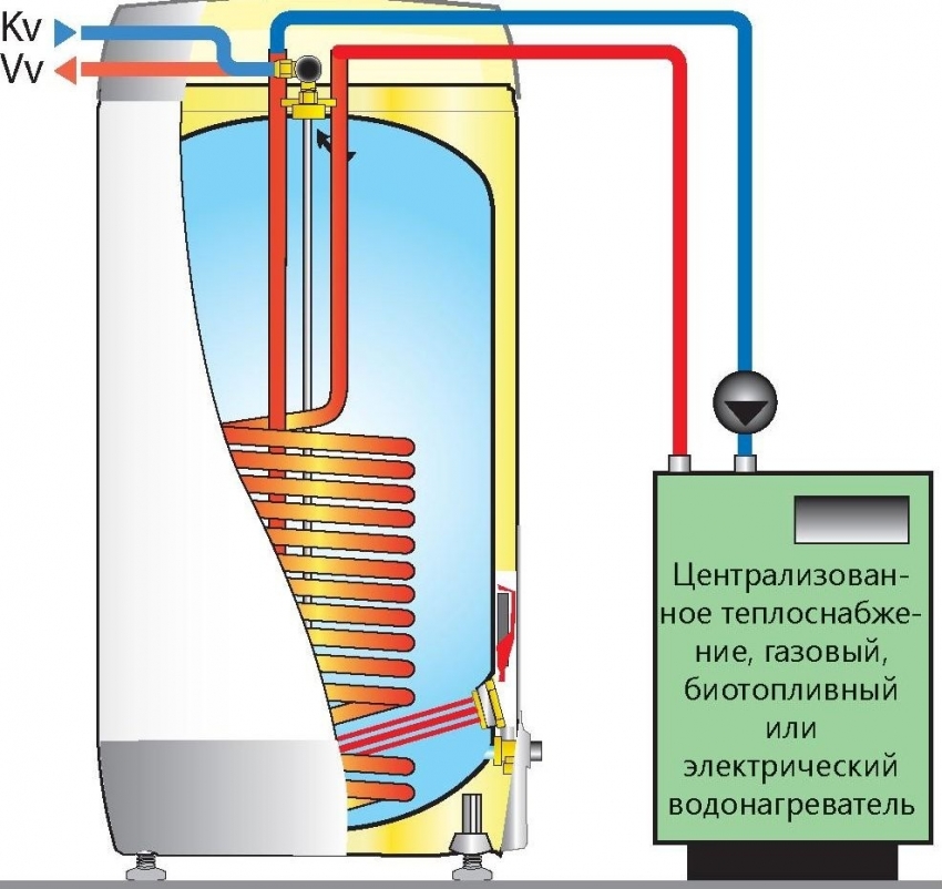 Se suministra agua fría al tanque para calentar y los consumidores toman agua caliente. Debe tenerse en cuenta que muchos fabricantes producen una caldera de calentamiento indirecto con varios intercambiadores de calor. Este diseño funciona de manera más eficiente, pero es extremadamente raro en el mercado.