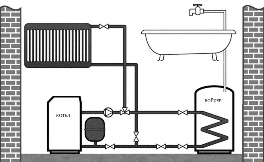 Gracias a este esquema para conectar una caldera de calentamiento indirecto, la eficiencia de este dispositivo aumenta. Después de todo, el calor se transfiere primero a capas calientes de agua.