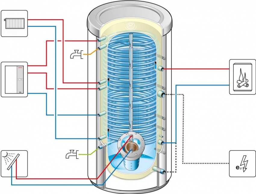 Es posible calentar agua en la unidad en cuestión utilizando una caldera de gas o combustible sólido, un calentador de agua solar o una bomba de calor. Además, su funcionamiento es posible en conjunto con equipos de calefacción de dos tipos: circuito simple y doble.