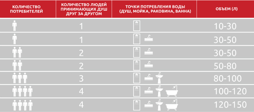 El volumen del tanque de la caldera debe seleccionarse en función del número de personas que viven en la casa y los puntos de consumo de agua.