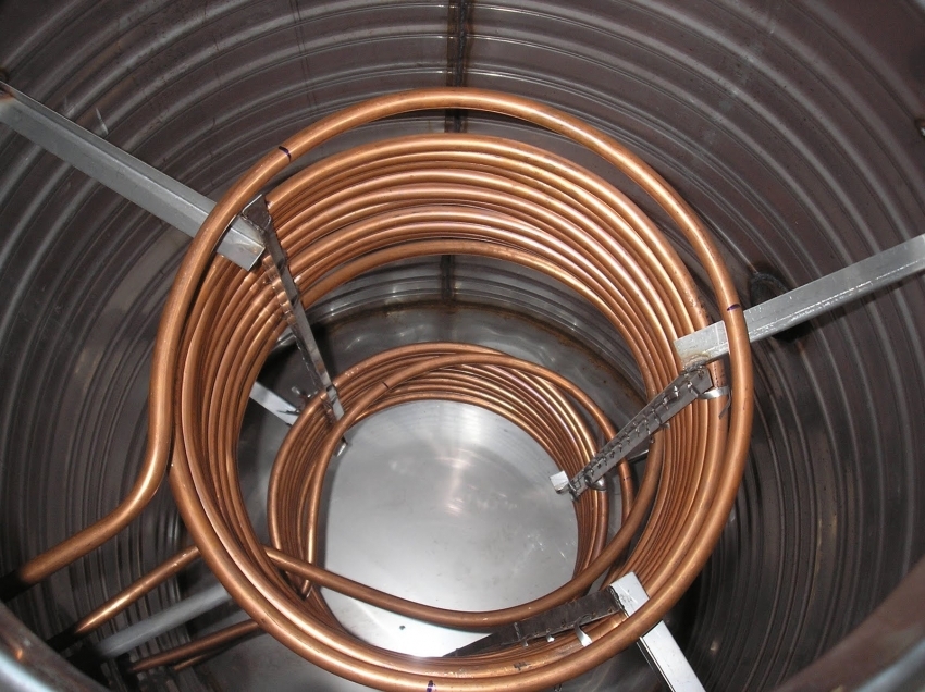 - Monte la bobina dentro del tanque a lo largo de sus paredes o en el centro. Suelde las tuberías a las tuberías de entrada y salida del tanque;