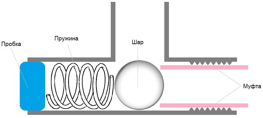 Si la presión del flujo excede la resistencia del resorte, entonces la parte móvil de la válvula abre un espacio para el paso del agua en una dirección determinada. Cuando se iguala la sobrepresión antes y después del dispositivo de seguridad, o la presión establecida después de que se excede la válvula, el resorte mueve los vástagos hacia el asiento.