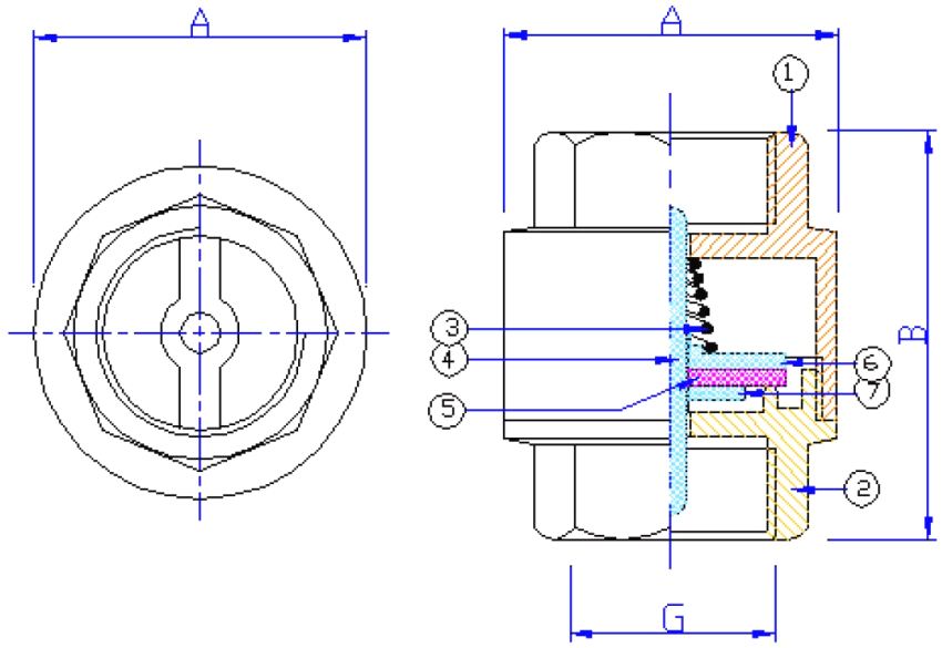 Dimensiones y principio de funcionamiento de la válvula de retención de resorte de acoplamiento: 1 y 2 - cuerpo; 3 - primavera; 4 - vástago de plástico; 5 - sellador; 6 - placa superior; 7 - placa inferior; A - 34,5-79 mm; B - 46-80,5 mm; G - 1 / 2-2 ″