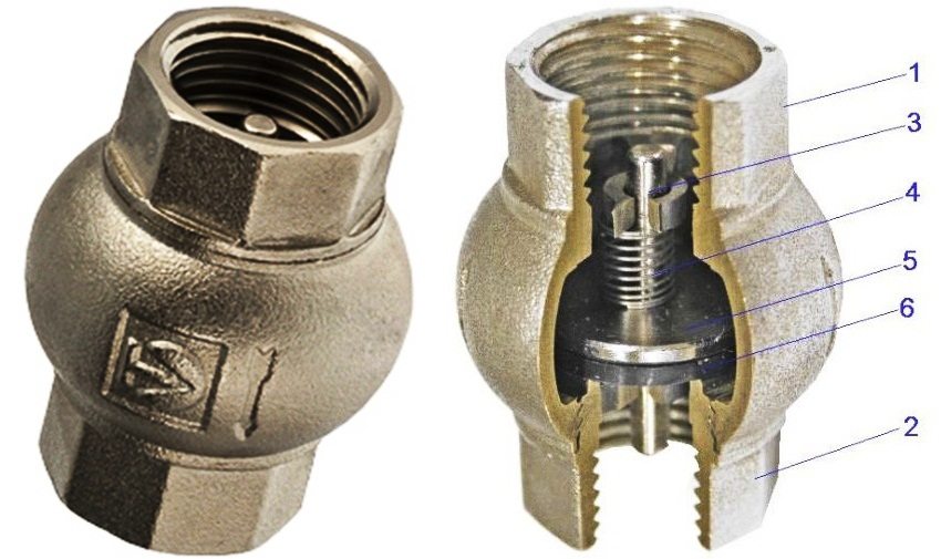 Dispositivo de válvula de retención de resorte con carrete de latón: 1 y 2 - cuerpo de latón niquelado, 3 - carrete móvil, 4 - resorte, 5 - placas de carrete de latón, 6 - junta de EPDM