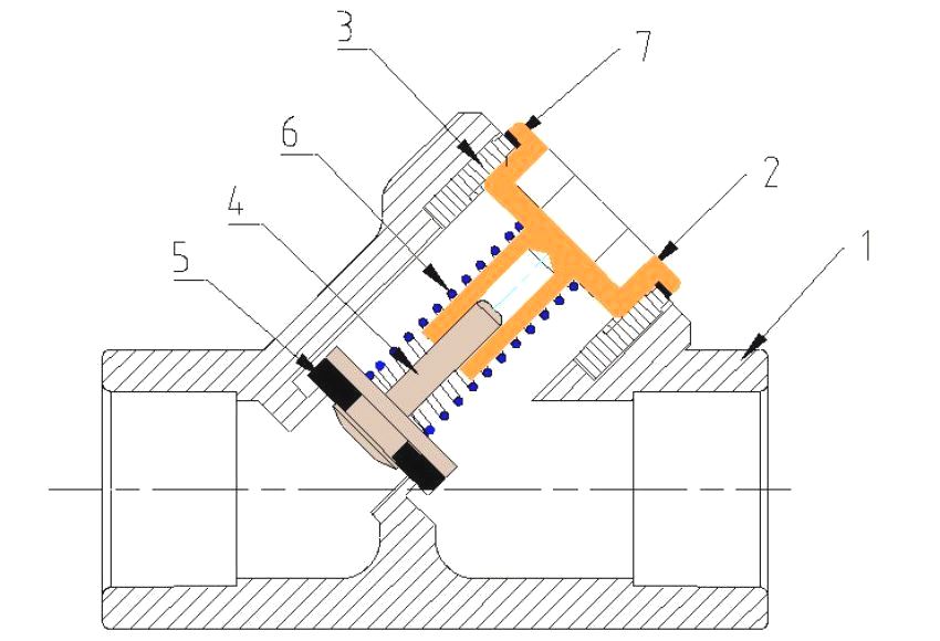 El dispositivo de una válvula de retención de resorte de polipropileno: 1 - cuerpo, 2 - tapón, 3 - inserto roscado, 4 - vástago con placa de carrete, 5 - arandela deslizante, 6 - resorte, 7 - anillo de sellado del tapón