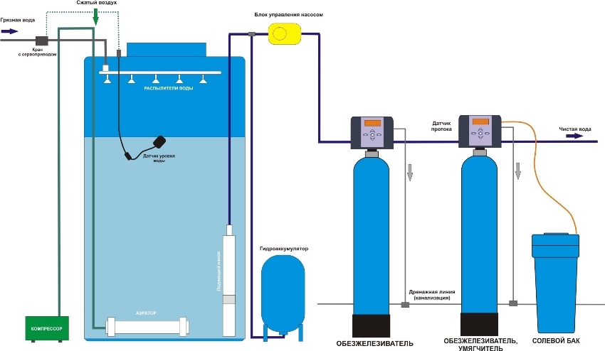 Desde la red de suministro de agua, el agua ingresa al tanque. Después del llenado máximo, se activa un sensor de flujo que activa el compresor. Luego, con la ayuda de un compresor, se dirige una corriente de aire a la cámara bajo una fuerte presión. La intensa interacción del agua con el aire conduce a la oxidación del hierro ferroso.