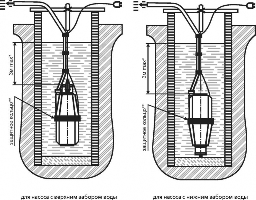 De acuerdo con el esquema típico del sistema de suministro de agua de una casa privada desde un pozo, se coloca una bomba sumergible dentro de la fuente de agua en un estado suspendido en un cable. La altura óptima de la unidad sobre la superficie inferior es de 0,8 m. Se puede utilizar una cuerda de acero o polímero para suspender la bomba sumergible.
