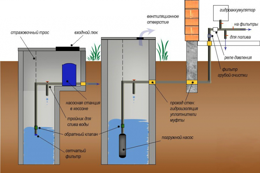 Para ingresar agua a una casa desde un pozo, se utilizan equipos de bombeo, que pueden ser tanto sumergibles como superficiales. Las versiones sumergibles de los dispositivos se pueden sumergir en líquido total o parcialmente. Son eficientes y silenciosos debido a la presión natural del agua. El aire fino no participa en este proceso. Los dispositivos sumergibles no necesitan conservación durante el clima frío. El líquido fluye por la tubería por sí solo, esto no requiere bombeo. El equipo de superficie está diseñado para pozos de no más de 10 m de profundidad.