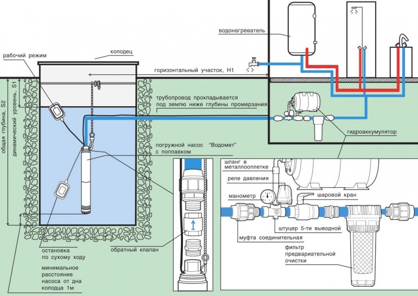 El proyecto de abastecimiento de agua del pozo debe incluir todos los elementos necesarios con indicación de su ubicación y otros datos técnicos. Además de los componentes principales (pozo, bomba, filtro inferior, relé y acumulador), hay otros componentes en el sistema.