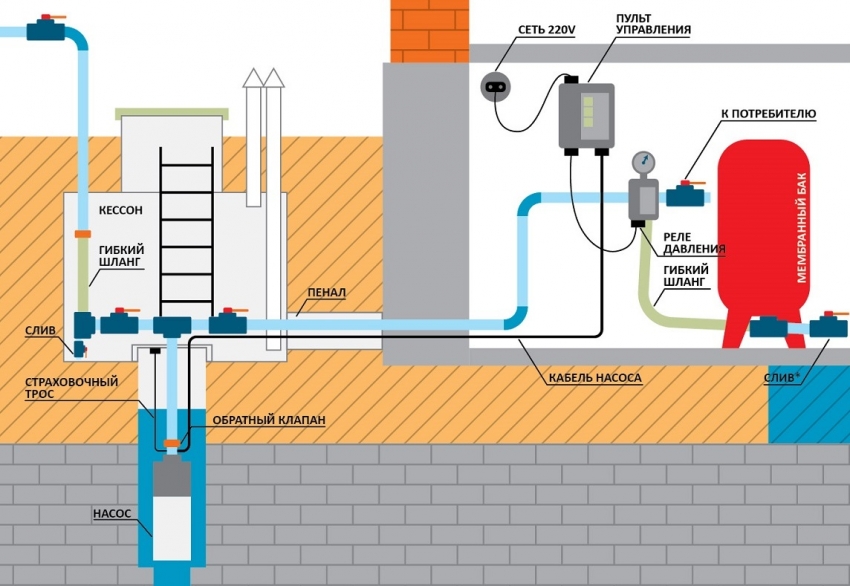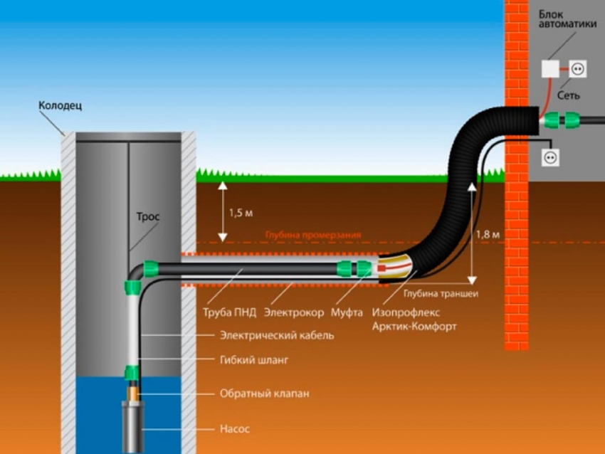 Diagrama de un dispositivo de suministro de agua para una casa privada que utiliza un pozo anticongelante, una bomba sumergible para elevar el agua y una estación de bombeo.