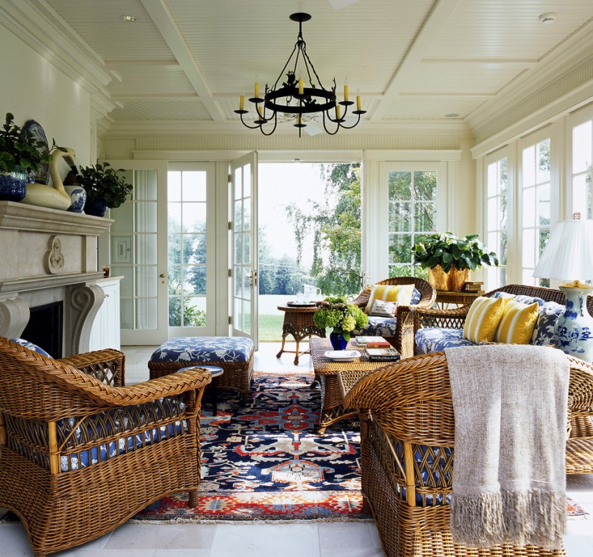 SISÄÄN olohuoneen sisustus Provence-tyylissä käytetään usein alkuperäisiä pajuhuonekaluja