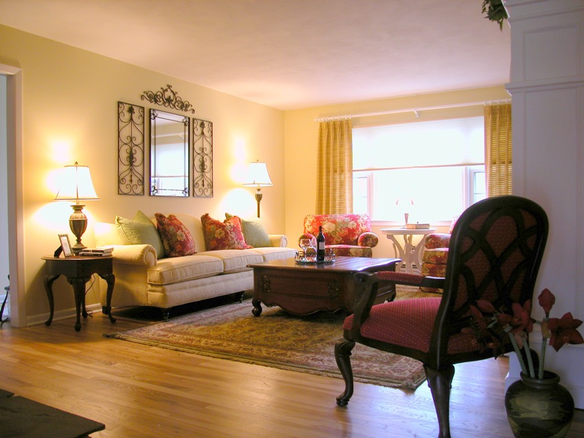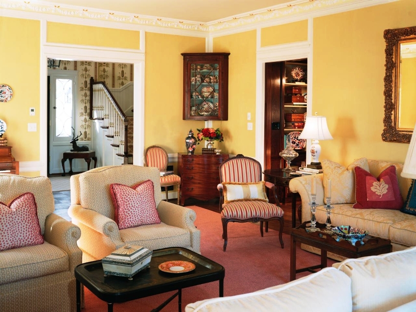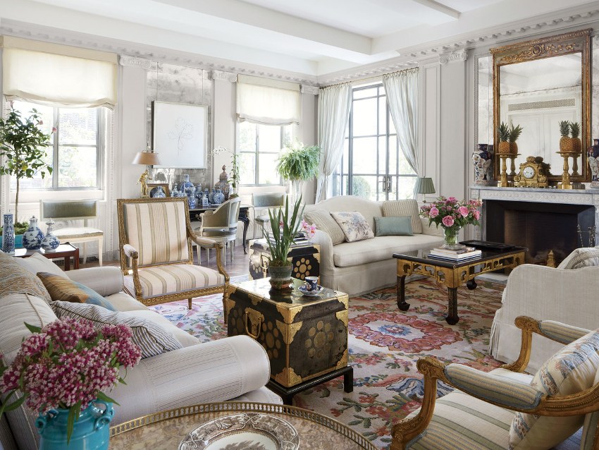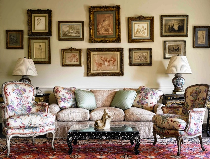 Kukkia voidaan käyttää kirkkaina aksentteina olohuoneessa. Näihin tarkoituksiin elävien kukkakimppujen lisäksi sopivat myös kuolleesta puusta tai pintakuvioista koostumukset. Provence-tyyliset verhot tai kukkakoristeella koristeltu sohva näyttävät värikkäiltä valokuvassa. Vaikka klassisen version muotoilu ei hyväksy tapettien käyttöä seinien koristeluun, harvinaisissa tapauksissa poikkeukset ovat sallittuja.
