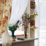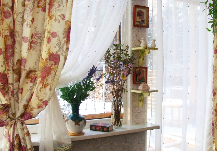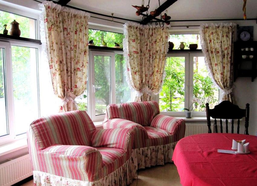 Silkkien ja sametin kaltaisten kankaiden käyttöä ei suositella. Materiaalit, joissa on massiiviset hapsut, kultaiset kuviot, koristeelliset lambrequins, eivät myöskään ole tervetulleita. Käsintehdyt raidat voidaan asettaa lattialle. Ikkunat täydentävät kauniisti kevyitä ja läpikuultavia verhoja, jotka on yhdistetty chintz- ja pellavakankaisiin.