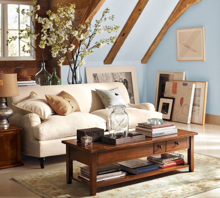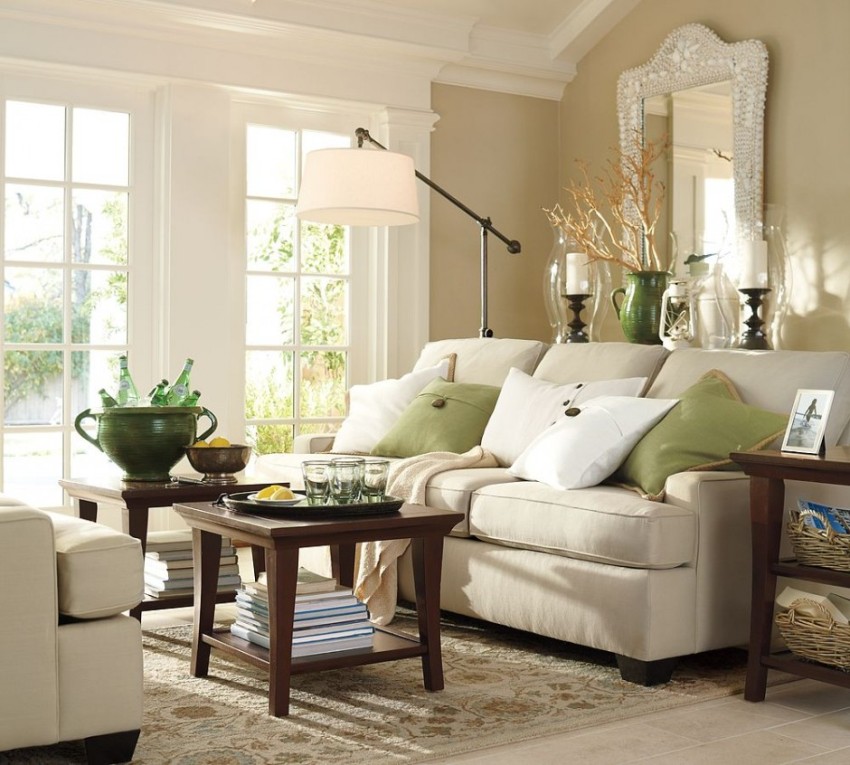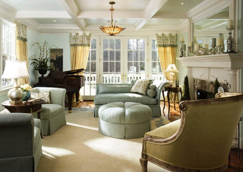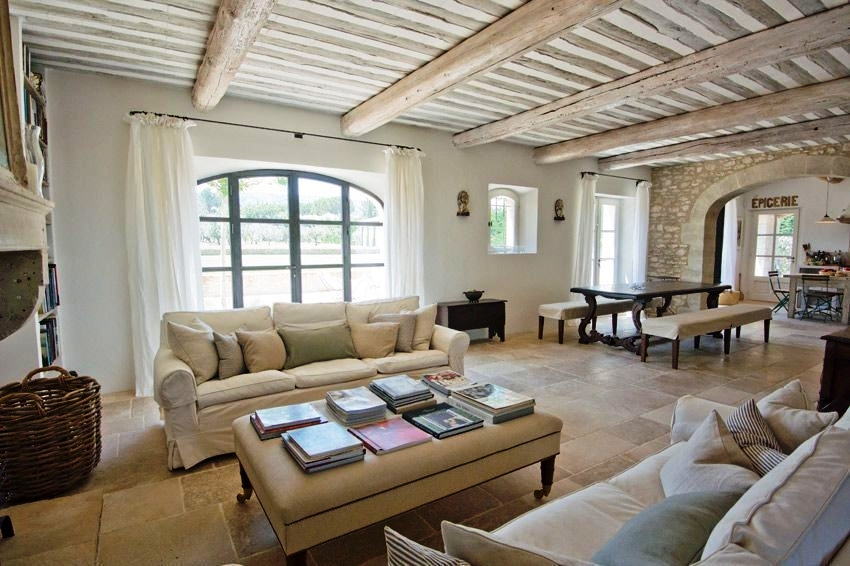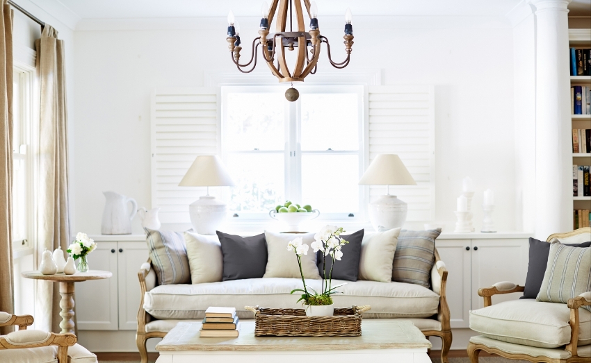 Kuvassa Provence-tyyliset olohuoneet on sisustettu useimmiten vaaleilla ja pastellisävyillä. Sisustukseen on suositeltavaa valita luonnolliset vaimennetut äänet.