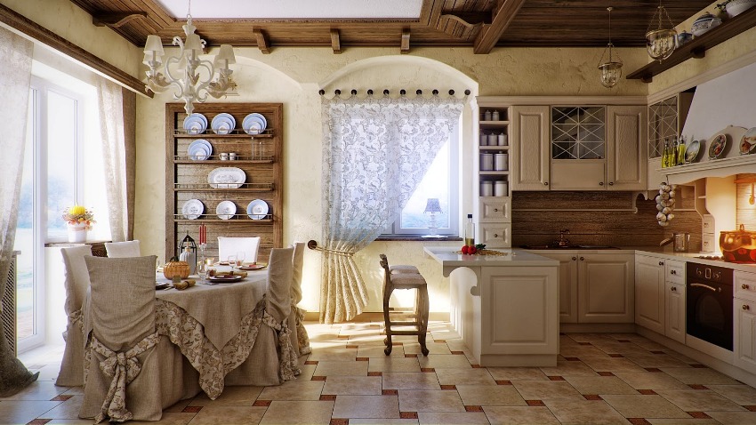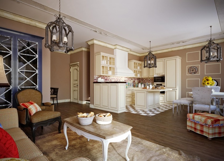 Nykyään Provencen tyyli keittiö-olohuoneen sisustus on yksi suosituimmista maalaistalojen ja kaupunkiasuntojen sisustuksessa