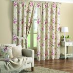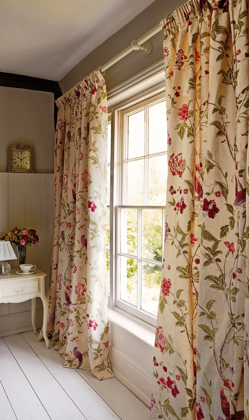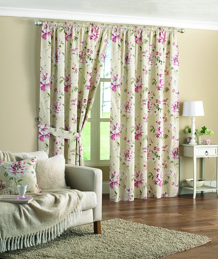 Huonekalujen verhot, verhot, lautasliinat ja pöytäliinat on valmistettu luonnonkankaista, joissa on kukkakuvioita