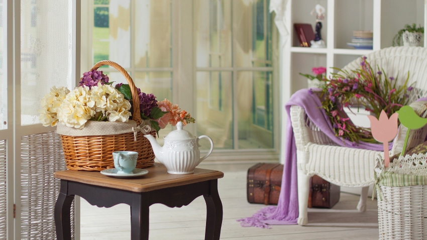 Provence-tyylisen sisustuksen piirre on runsaasti tuoreita kukkia ja herbaarioita sekä posliini- ja keramiikkahahmoja