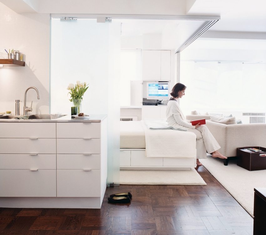 Vaihtoehto sopii tilaviin yksiöihin tai omakotitaloihin, joissa on tärkeää käyttää koko aluetta järkevästi jakamalla se oikein toiminnallisille alueille.