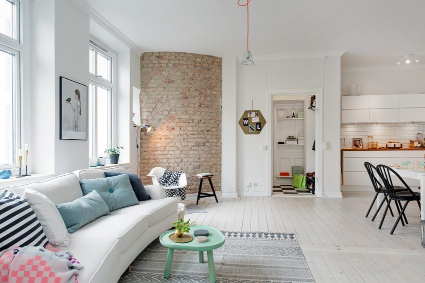 Sinun ei tarvitse purkaa koko seinää. Hän voi myös sopia harmonisesti huoneiston remontoituun sisustukseen. Esimerkiksi vyöhykkeiden välisen seinän kapean osan muodossa. Voit kiinnittää taulutelevision tai kuvan siihen olohuoneen sivulta ja asentaa pesuallas tai kodinkoneet keittiön puolelta. Voit purkaa osan seinästä jättäen pienet sarakkeet.