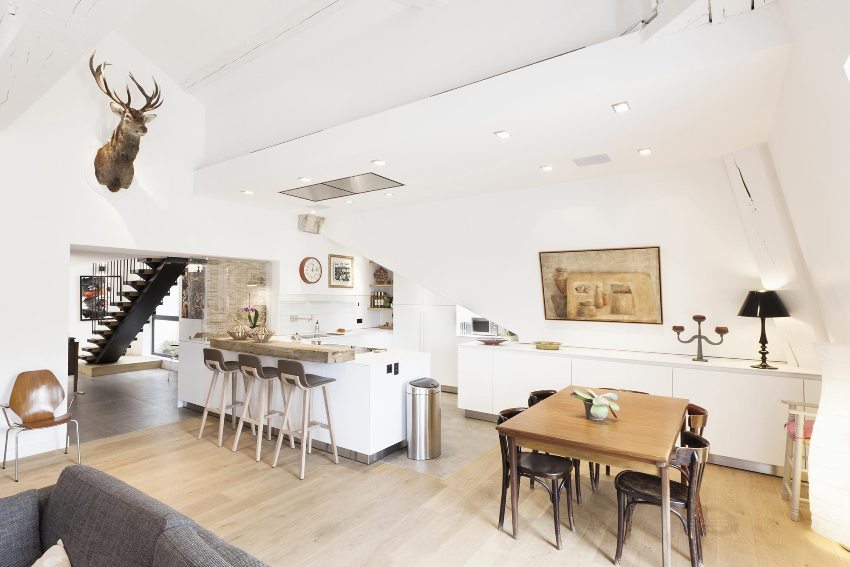 Klassikko soveltuu hyvin keittiöihin yhdistettynä olohuoneeseen. Valokuvat osoittavat täysin selkeät viivat, kalliit puukalusteet, tarpeettomien yksityiskohtien puuttumisen ja pelkät vaaleat seinät.