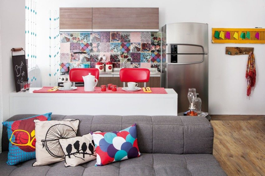 Tämä kaavoitusvaihtoehto sopii erinomaisesti pienen olohuoneen ja keittiön yhdistelmän kauniiseen suunnitteluun (erikoistuneiden sivustojen valokuvat osoittavat tämän), sijoittamalla oikeat aksentit kirkkaiden sävyjen avulla. On vain tärkeää muistaa yksinkertaiset säännöt: