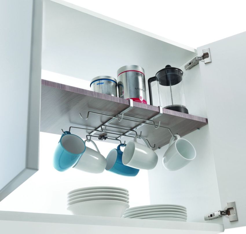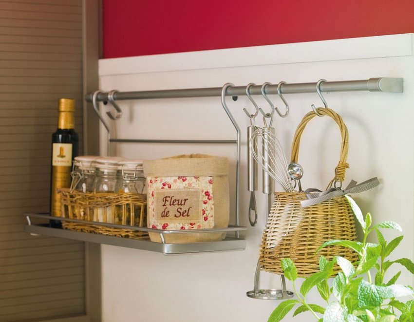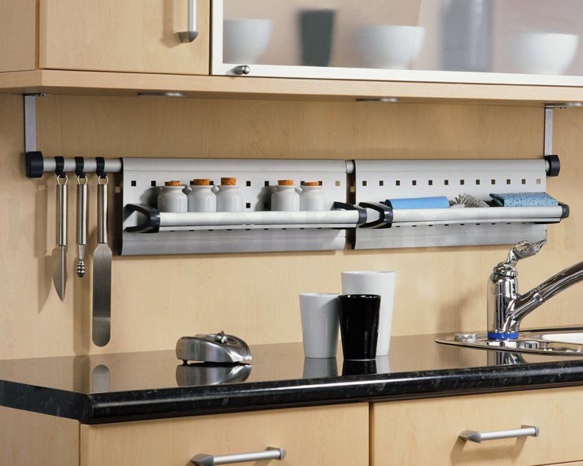 Piilotetun säilytysjärjestelmän varustamiseksi kattokaiteet voidaan kiinnittää kaapin ovien ja alustojen sisäpintaan. Jos huoneen seinät eivät ole täynnä huonekaluja, voit sijoittaa pidikkeet eri korkeuksiin katkoviivana ja voittaa siten keittiön geometrian. Tämä mahdollistaa paitsi keittiövälineiden vyöhykkeen niiden tarkoituksen mukaan, myös alkuperäisen ja epätavallisen sisustuselementin saamisen.