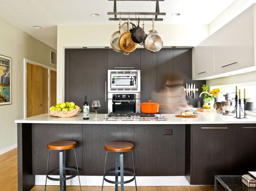 Jos keittiötila on ylikuormitettu huonekaluilla, minkä vuoksi minkä tahansa baarivaihtoehdon sijoittaminen on mahdotonta, voit sijoittaa huonekaluihin kiinnitetyt piilotetut baarit tai keittiökiskokahvat. Ensimmäinen vaihtoehto on kiinnitetty ovien kaappien sisään. Tähän on kätevää sijoittaa kauhat, lapiot, vispilät, suuret lusikat ja muut esineet.