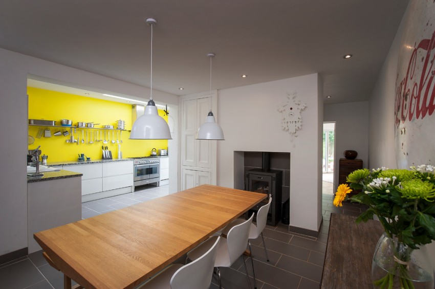 Keittiöesiliina Koristeltu kirkkaan keltaisella karkaistulla lasilla ja säilytyskaiteilla